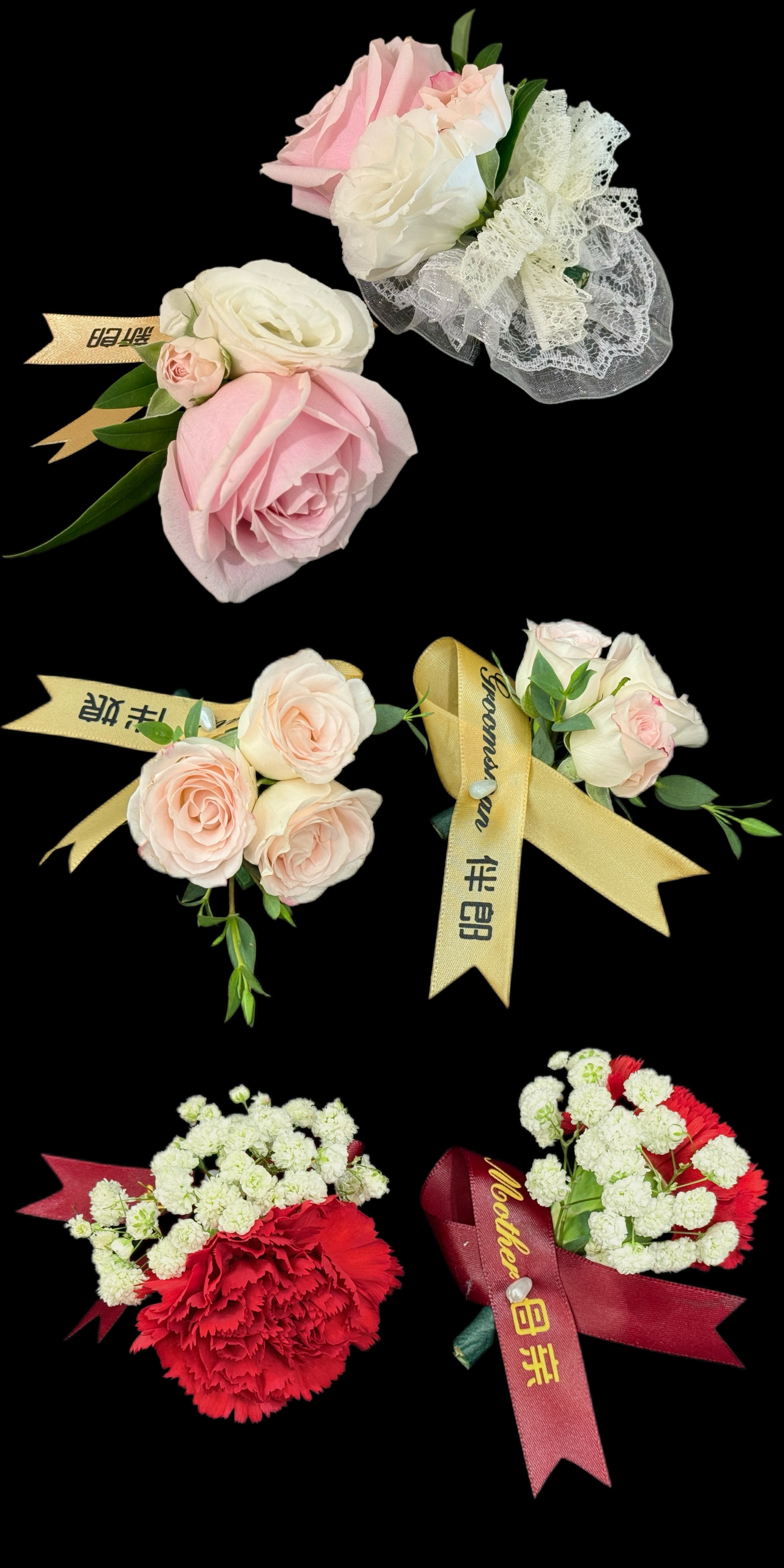父母胸花:康乃馨➕满天星或者红豆 伴郎伴娘:多头玫瑰 新郎新娘:玫瑰➕桔梗、多头(玫瑰颜色根据手捧花颜色决定)